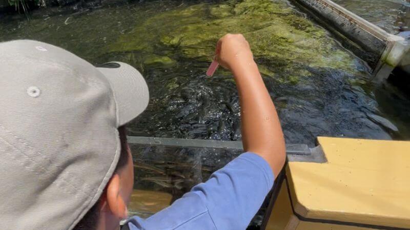 大きな水槽の中に、ウグイ、アブラハヤ、オイカワ、コイがたくさん泳いでいて、手で直接ごはんをあげるという体験コーナーです。